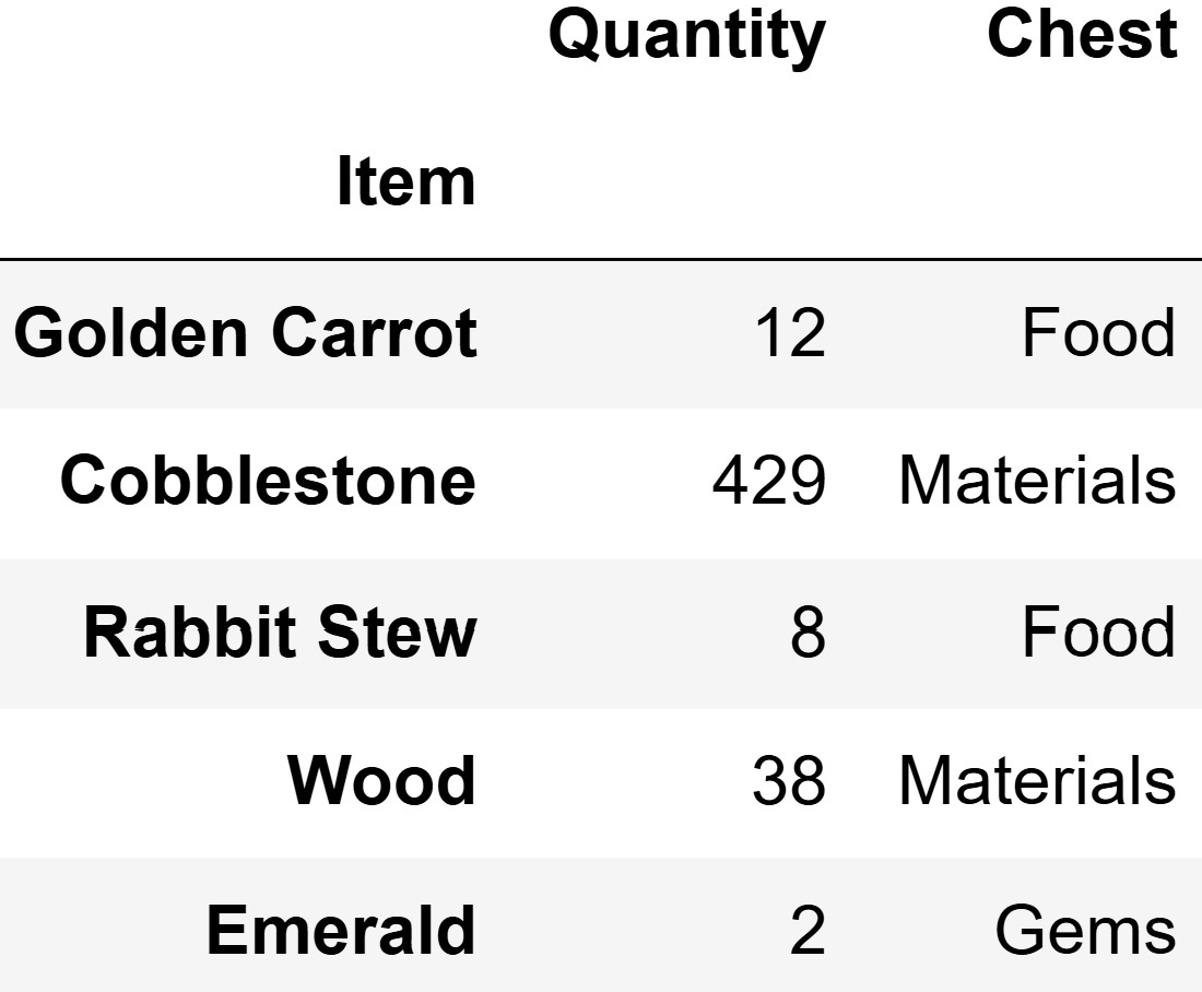 items.get("Chest") == "Materials"items.get("Quantity") >= 416shape[0]Note that answer (a) and (b) may be swapped.