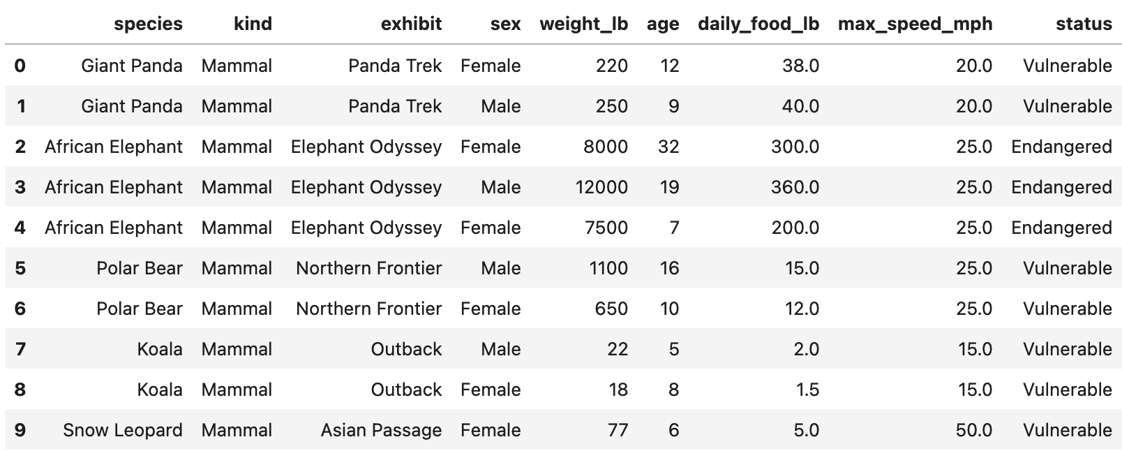 in pounds."age" (float): The animal’s age."status" (str): Conservation status
