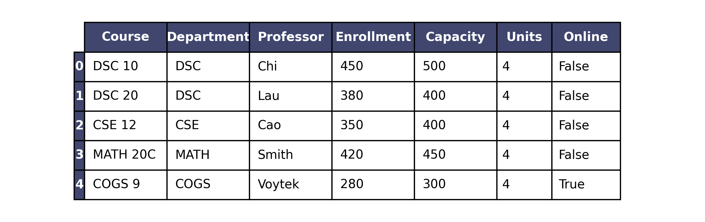 courses.get("Enrollment").iloc[0] != courses.get("Enrollment").loc[0]Answer: False