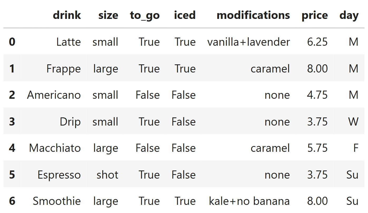 where each row corresponds to an individual drink order. The columns are